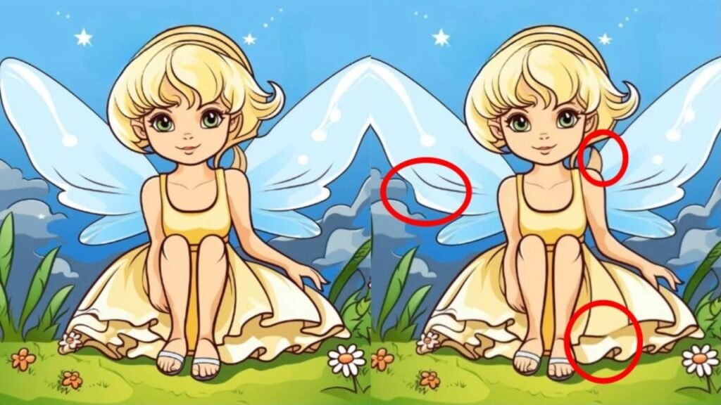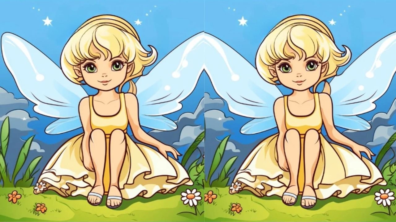 The above pictures depict a little fairy seated on the ground and it is cute. On the surface, it would seem that the two images are the same. The backgrounds, colors and shapes are all similar. Having a closer look, however, you will find that there are three minor differences.